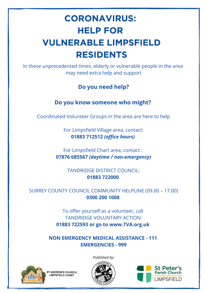 If you are in need of help with shopping, pharmacy collection, please contact the parish clerk – clerk@limpsfield.org.