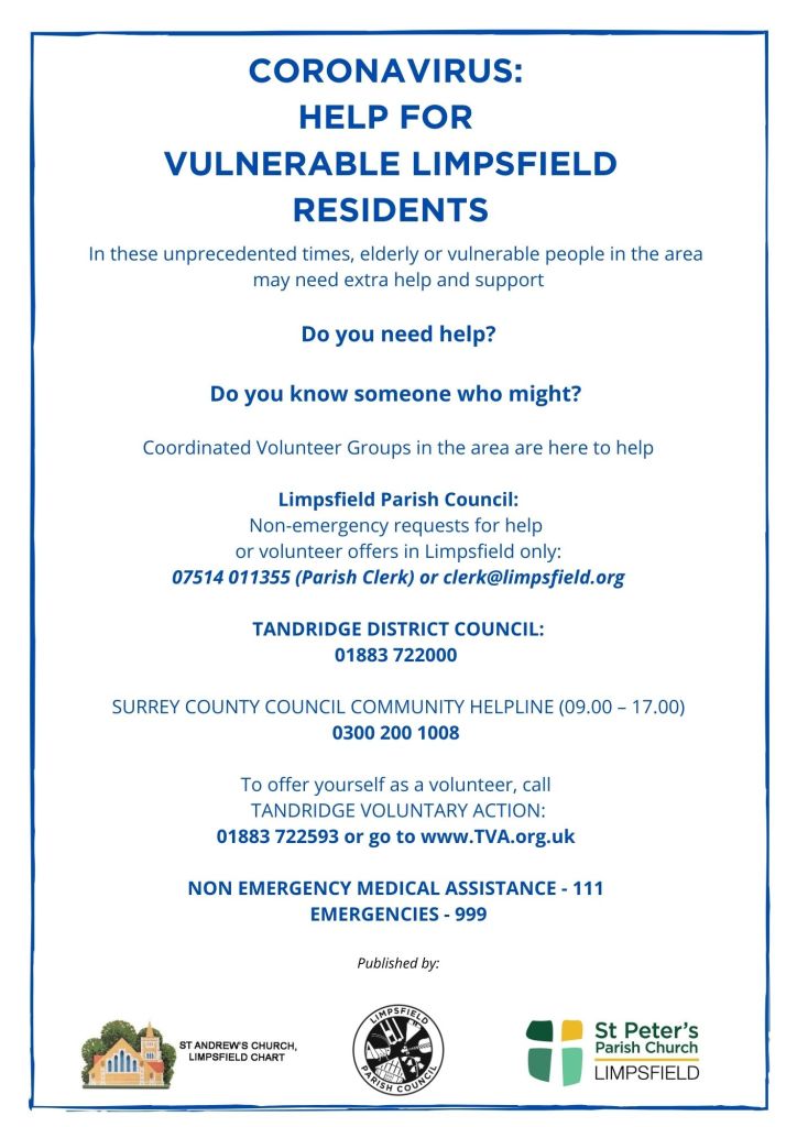 Please contact Limpsfield Parish Clerk if you are happy to volunteer as a helper at this time – clerk@limpsfield.org. You can also contact Tandridge Voluntary Action to register as a volunteer.