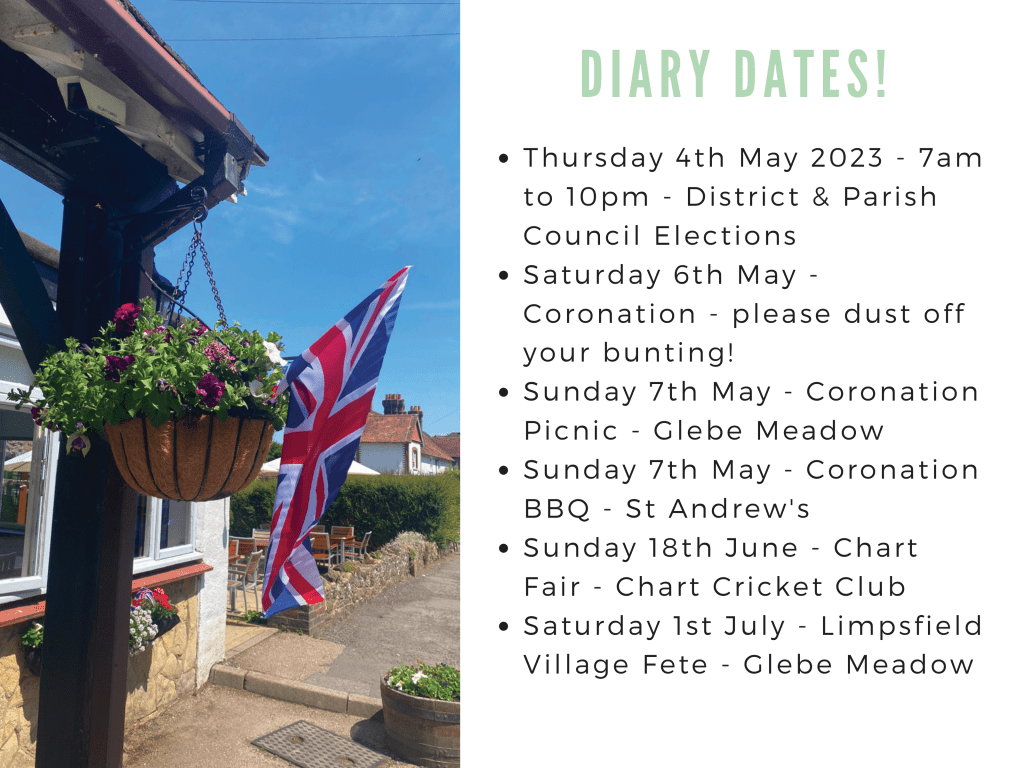 Please don’t forget it’s the Parish AND District elections on 4th May. Voting is at St Andrew’s Village Hall (for Limpsfield South) and St Peter’s Church Hall (for Limpsfield North). You MUST have photo ID this year to vote.