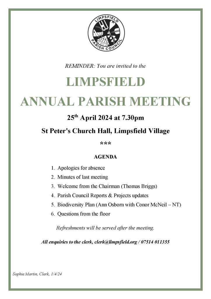 The Annual Parish Meeting is this Thursday, 25th April 2024 at 7.30pm at St Peter’s Church Hall, Limpsfield Village and it would be great to see as many parishioners as possible.