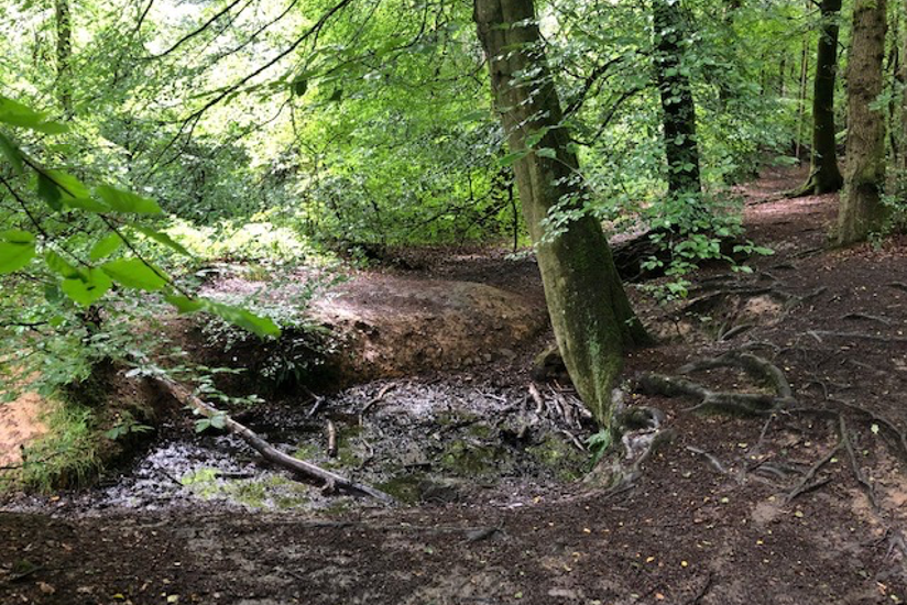 Stay on the main path and look across to a large beech tree, beside this is a spring, but during dry periods the water may not be flowing.
