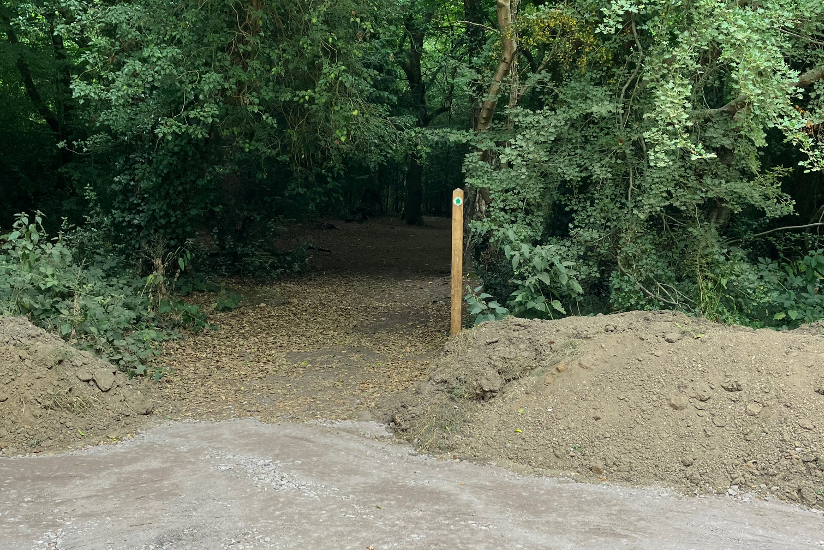 Continue along the track until reaching a post with arrow pointing to the right. Find the next post and head through the woods with the bank on your left.
