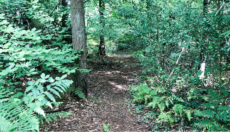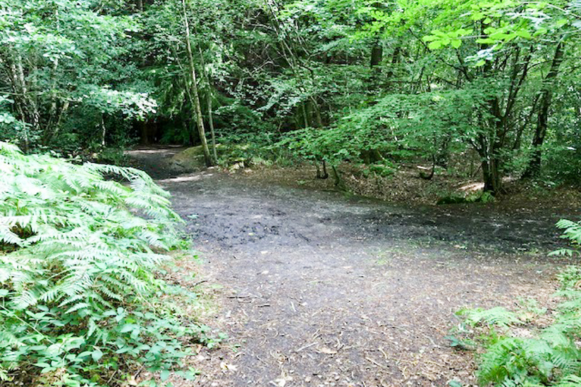 Facing away from the road, head along the path diagonally left into the woods until you come to a small open area with a steep bank on the right.
